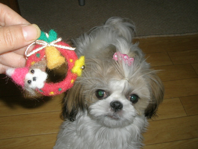 >お友達のプレゼントのフワフワの拓ちゃん達とリース 心がこもって嬉しいね