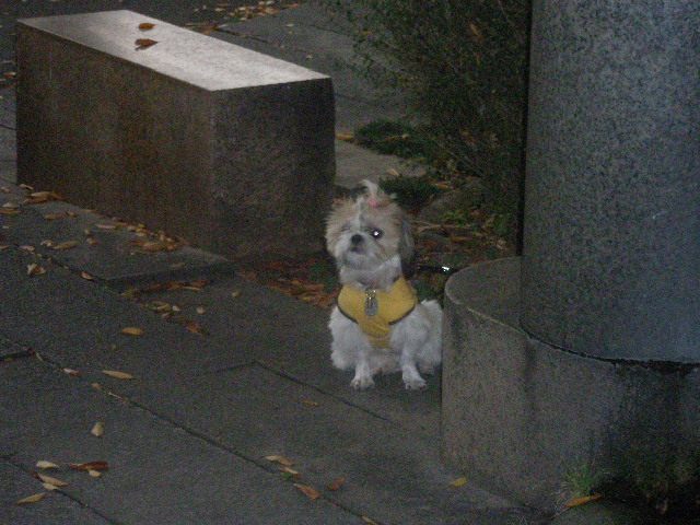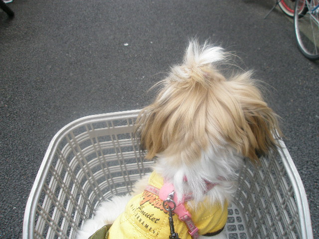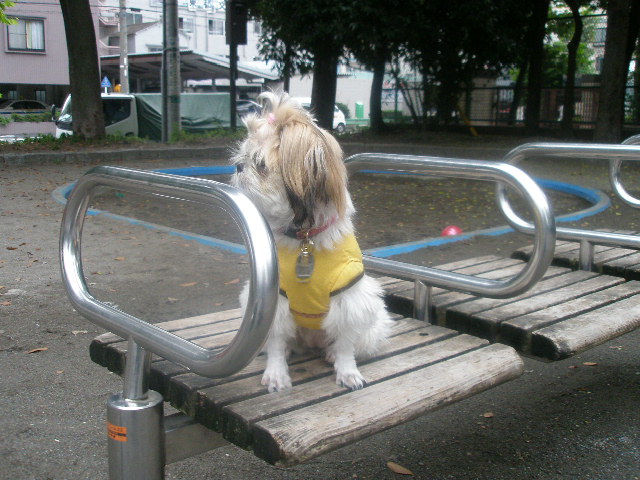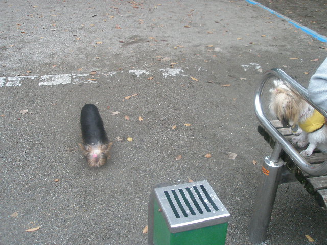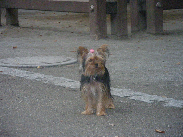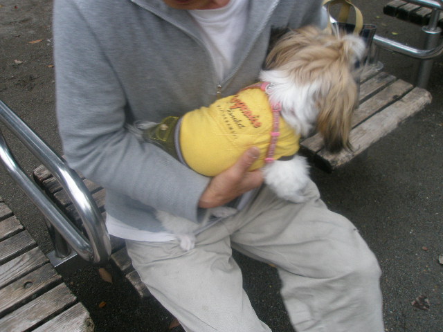 >ヨーキーちゃんの飼い主さんのひざの上にぽんっと。