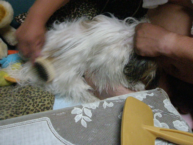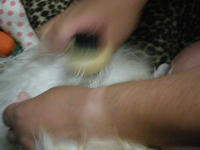 >拓ちゃん、パパさんとママさんとでお手入れですか。気持ち良いよね。フワフワさらさらでとっても綺麗ね。