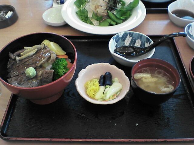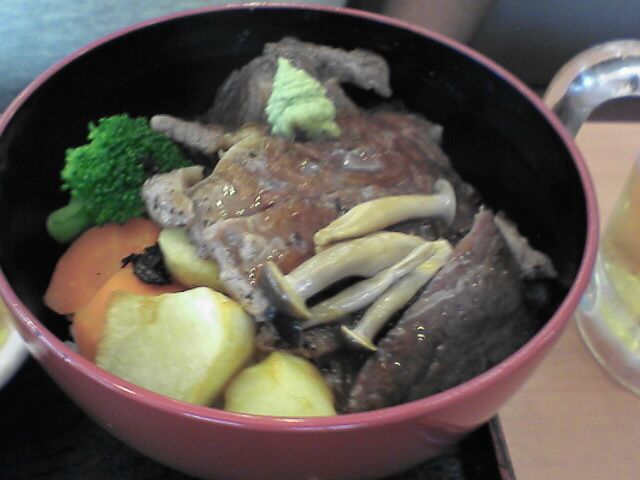 >ビールにステーキ丼(^。、^)ジュルジュル