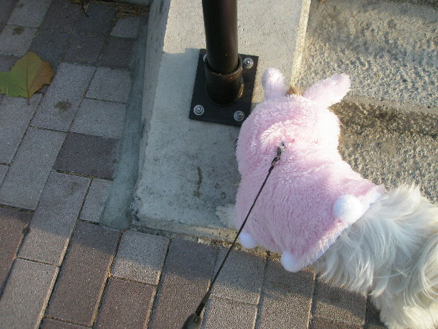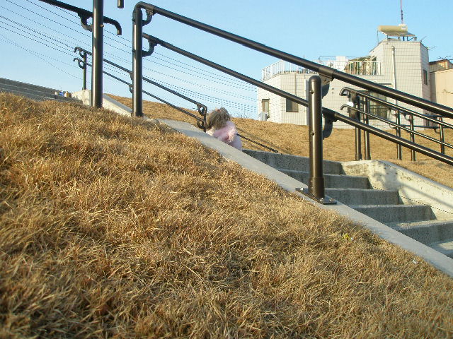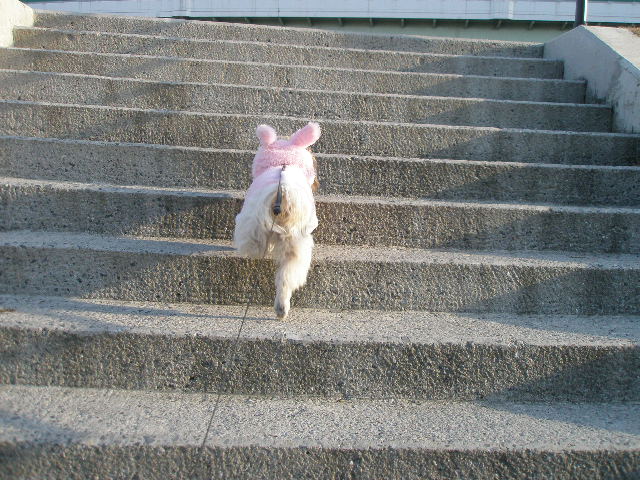 >階段駆け上がる、ウサギさん拓ちゃんの後姿。