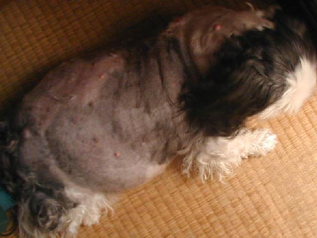 まだ凹んでる?拓パパさん、びっくりしてない?これもお薬付けるためと分かって安心しましたよ~!まだサマーカットには早すぎるって思ったから(汗)アレルギーで毛が抜けると生えるにも時間かかるけど、そうじゃないから早く生えるのね。それまでは洋服着てればいいか!散歩も無いしね。