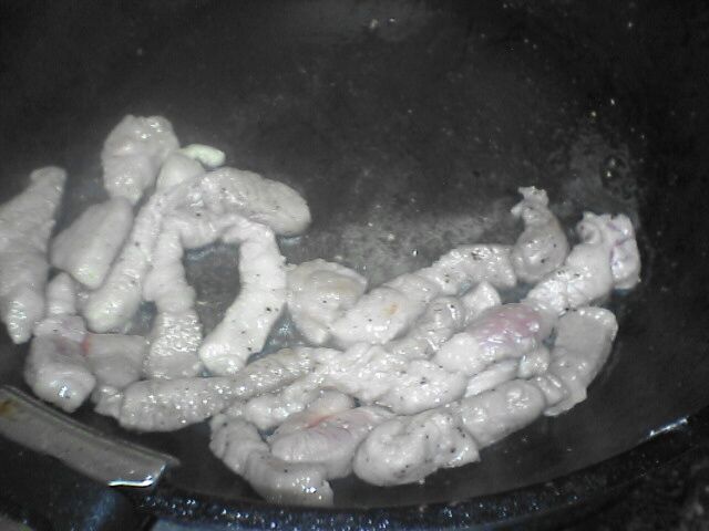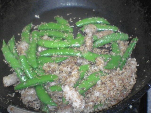 色が少し変わったら、豚肉とスナップえんどうをいれ、軽く炒め、塩・コショウで味を整える。