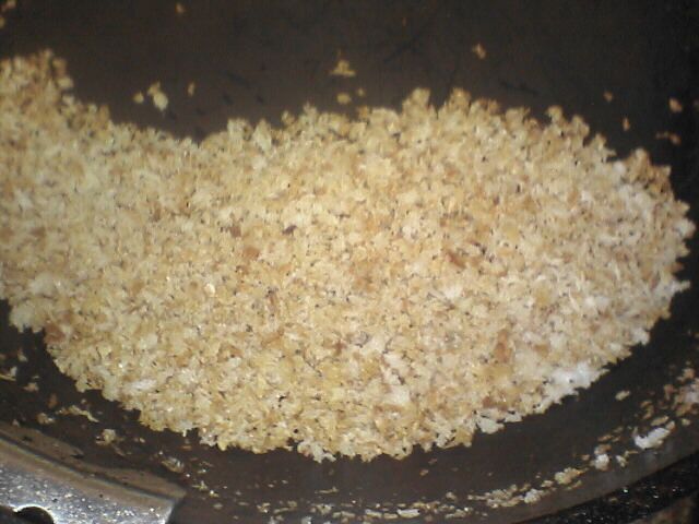 フライパンにオリーブオイルを熱し、にんにくを炒め香りが出たら・パン粉・粉チーズをいれて炒め