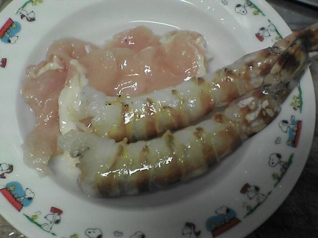 海老、鶏肉に塩、酒を振りかけ下味付けて置いてください
