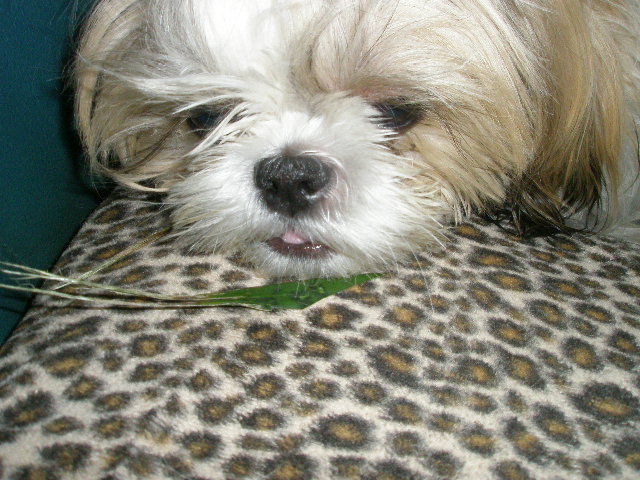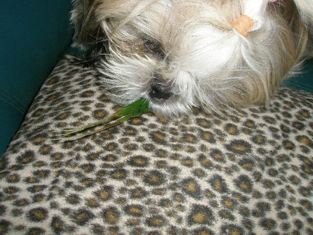 >サスケ、サラのお尻クンクン、変だなって思ったら肛門さんから長い葉っぱが生えていたわ(汗)拓美ちゃん、よく噛んで食べてね(笑)