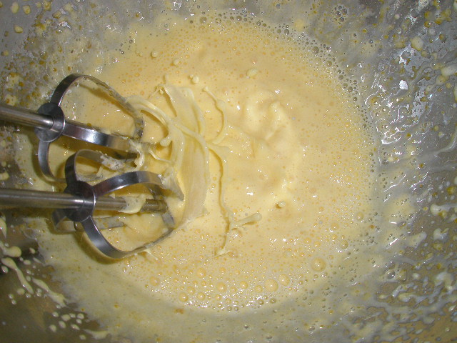 3. (ハンドミキサーを洗わなくてもOK)ハンドミキサーで卵黄を軽く混ぜ、塩と残りの砂糖を加えて混ぜてマヨネーズ状にし、サラダ油を少しずつ加えながら、よく混ぜる。次に水を加えて混ぜ、レモン汁を加えて混ぜる。