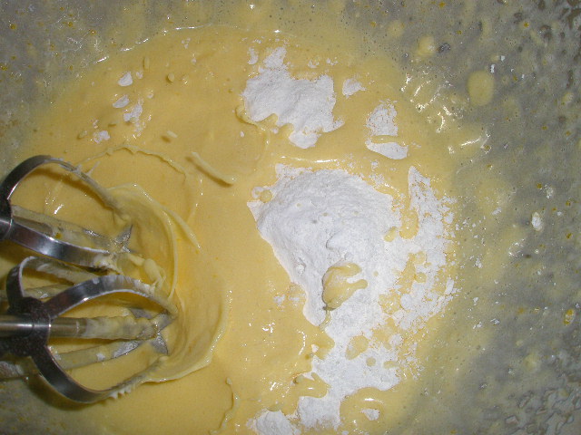 4.1の粉を広げて加え、ハンドミキサーの低速で、ダマが残らないように混ぜる。(15秒ほど)