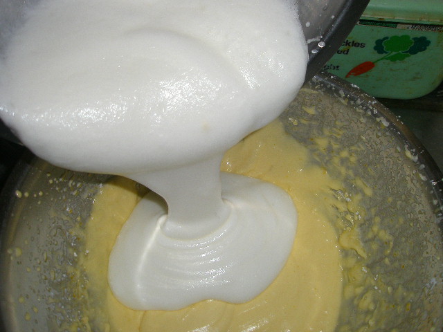 5. ゴムベラに持ち替えて、4にメレンゲの1/3量を加えて、よく混ぜ、残りのメレンゲを加えて、さっくりと、でもメレンゲの塊が残らないように混ぜる。